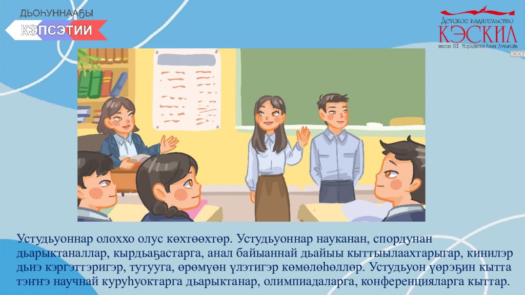 Хас биирдии оҕо оскуолатын бүтэрэн баран устудьуон буолар кыахтаах. Ону тэҥҥэ устудьуоннар хамсаныыларыгар көхтөөхтүк кыттан элбэх туһаны аҕалыан сөп. Үөрэҕин бүтэрэн баран идэни баһылаан дойдутун сайдыытыгар улахан кылааты киллэрэр киһи буоларга дьулуһуохтаах.