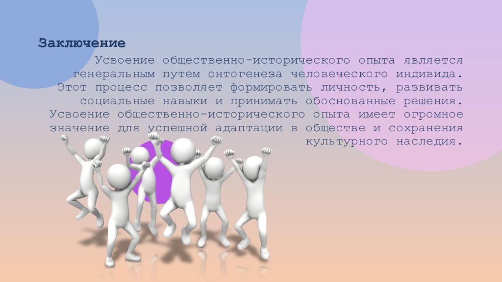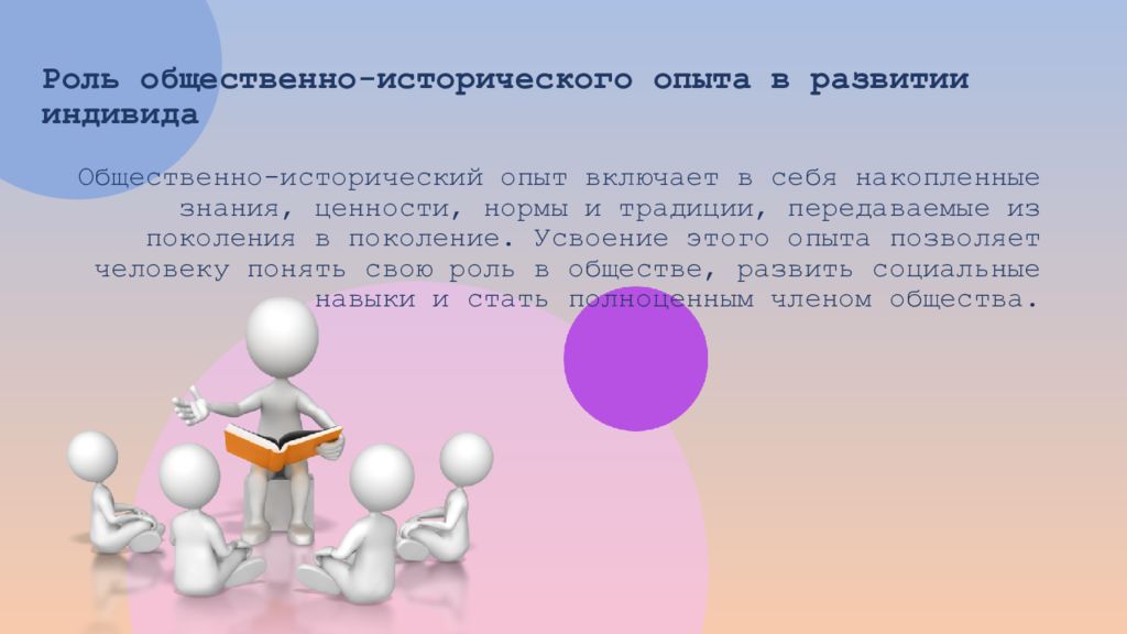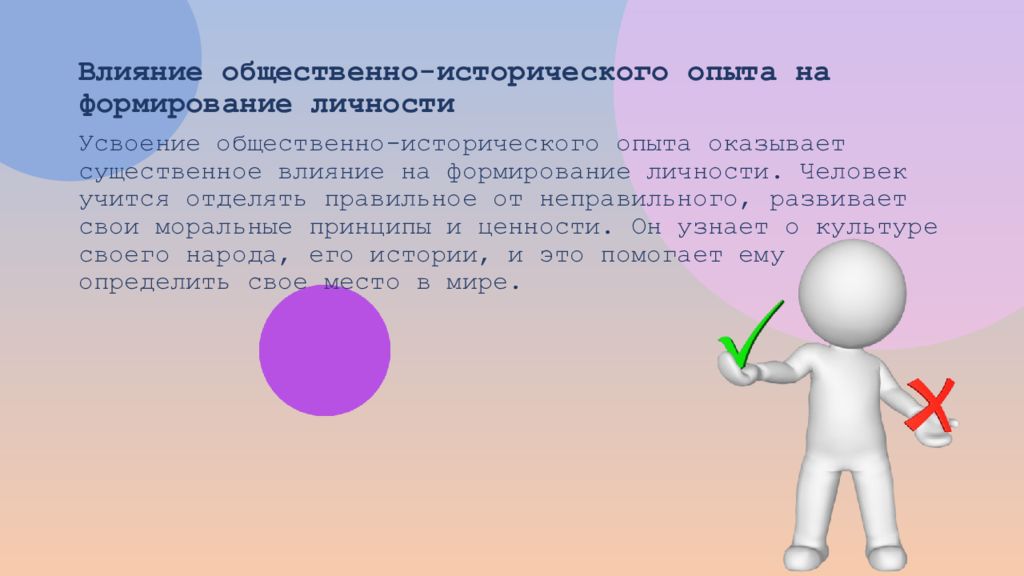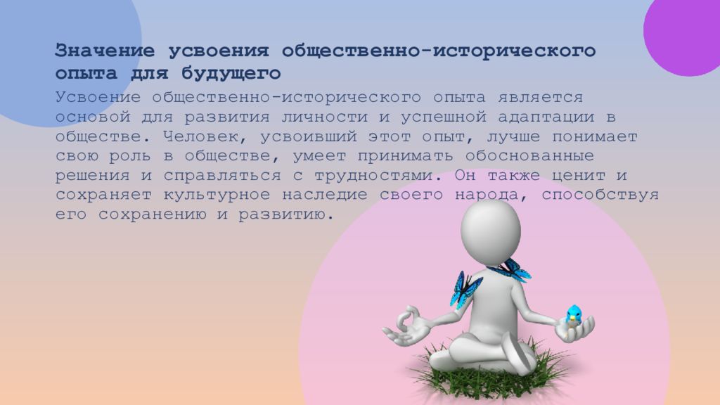 Усвоение общественно-исторического опыта оказывает существенное влияние на формирование личности. Человек учится отделять правильное от неправильного, развивает свои моральные принципы и ценности. Он узнает о культуре своего народа, его истории, и это помогает ему определить свое место в мире.