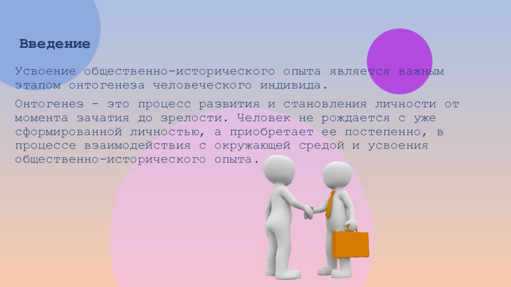 Усвоение общественно-исторического опыта является важным этапом онтогенеза человеческого индивида. Онтогенез - это процесс развития и становления личности от момента зачатия до зрелости. Человек не рождается с уже сформированной личностью, а приобретает ее постепенно, в процессе взаимодействия с окружающей средой и усвоения общественно-исторического опыта.