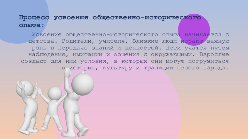 Усвоение общественно-исторического опыта начинается с детства. Родители, учителя, близкие люди играют важную роль в передаче знаний и ценностей. Дети учатся путем наблюдения, имитации и общения с окружающими. Взрослые создают для них условия, в которых они могут погрузиться в историю, культуру и традиции своего народа.