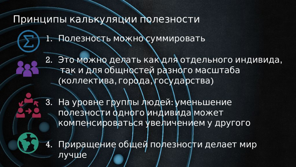 Принципы калькуляции полезности Полезность можно суммировать Это можно делать как для отдельного индивида, так и для общностей разного масштаба (коллектива, города, государства) На уровне группы людей : уменьшение полезности одного индивида может компенсироваться увеличением у другого Приращение общей полезности делает мир лучше