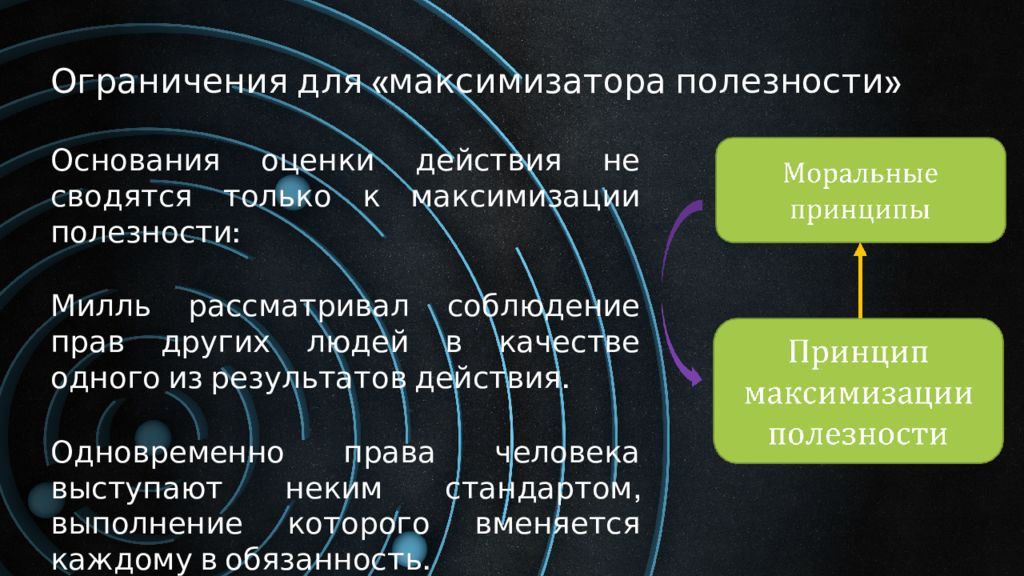 Ограничения для « максимизатора полезности» Основания оценки действия не сводятся только к максимизации полезности: Милль рассматривал соблюдение прав других людей в качестве одного из результатов действия. Одновременно права человека выступают неким стандартом, выполнение которого вменяется каждому в обязанность.