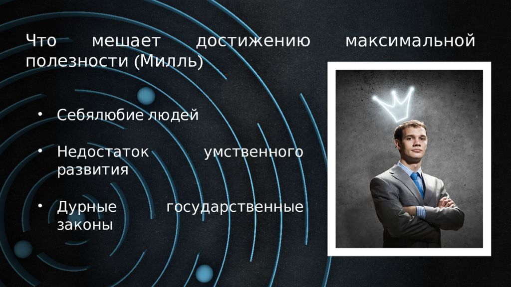 Что мешает достижению максимальной полезности (Милль) Себялюбие людей Недостаток умственного развития Дурные государственные законы