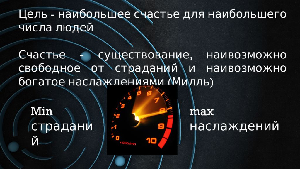 Цель - наибольшее счастье для наибольшего числа людей Счастье - существование, наивозможно свободное от страданий и наивозможно богатое наслаждениями (Милль) Min страданий max наслаждений