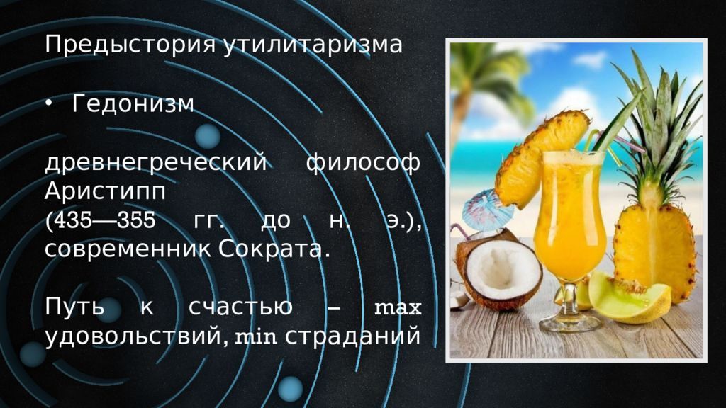 Предыстория утилитаризма Гедонизм древнегреческий философ Аристипп (435—355 гг. до н. э.), современник Сократа. Путь к счастью – max удовольствий, min страданий