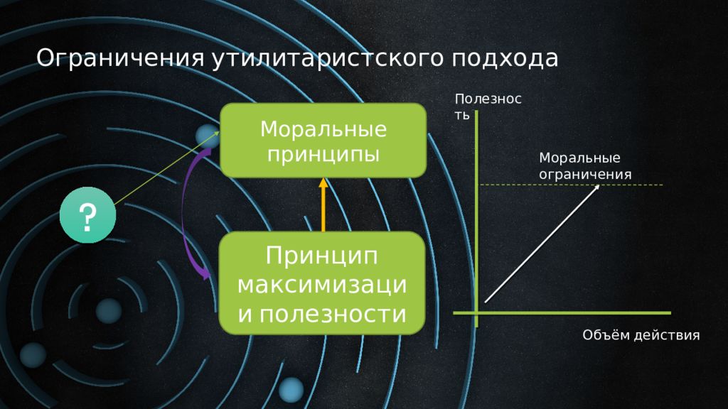 Ограничения утилитаристского подхода Моральные принципы Принцип максимизации полезности Полезность Объём действия ? Моральные ограничения