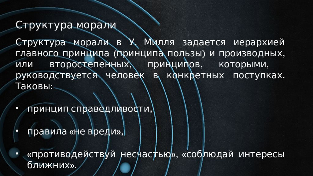 Структура морали Структура морали в У. Милля задается иерархией главного принципа (принципа пользы) и производных, или второстепенных, принципов, которыми, руководствуется человек в конкретных поступках. Таковы : принцип справедливости, правила «не вреди», «противодействуй несчастью», «соблюдай интересы ближних».