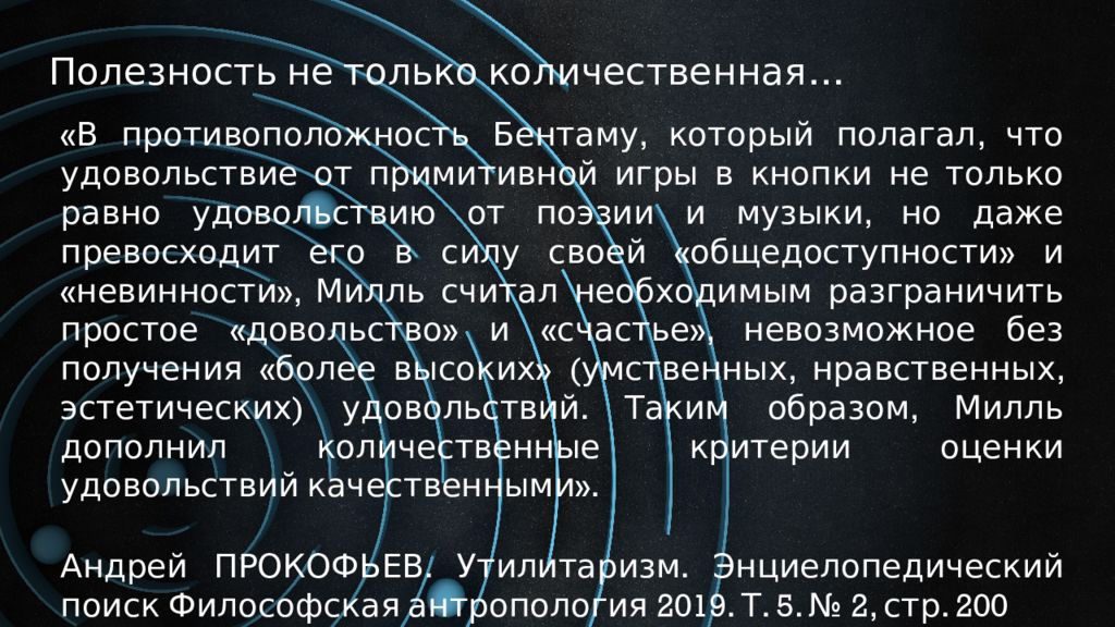 Полезность не только количественная … «В противоположность Бентаму, который полагал, что удовольствие от примитивной игры в кнопки не только равно удовольствию от поэзии и музыки, но даже превосходит его в силу своей «общедоступности» и «невинности», Милль считал необходимым разграничить простое «довольство» и «счастье», невозможное без получения «более высоких» (умственных, нравственных, эстетических) удовольствий. Таким образом, Милль дополнил количественные критерии оценки удовольствий качественными». Андрей ПРОКОФЬЕВ. Утилитаризм. Энциелопедический поиск Философская антропология 2019. Т. 5. № 2, стр. 200