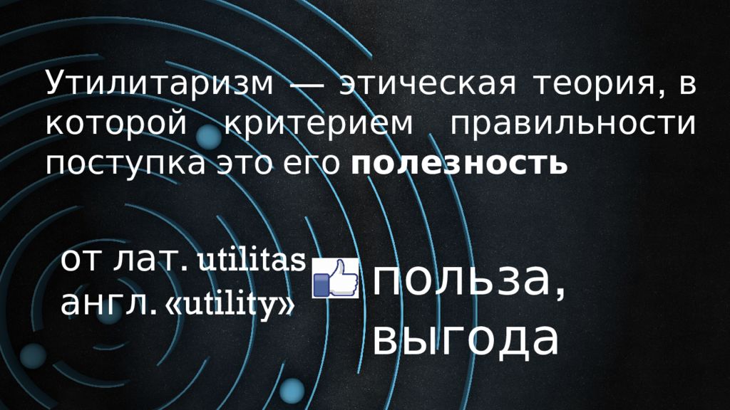 Утилитаризм — этическая теория, в которой критерием правильности поступка это его полезность от лат. utilitas англ. « utility » польза, выгода