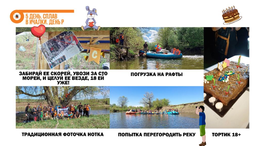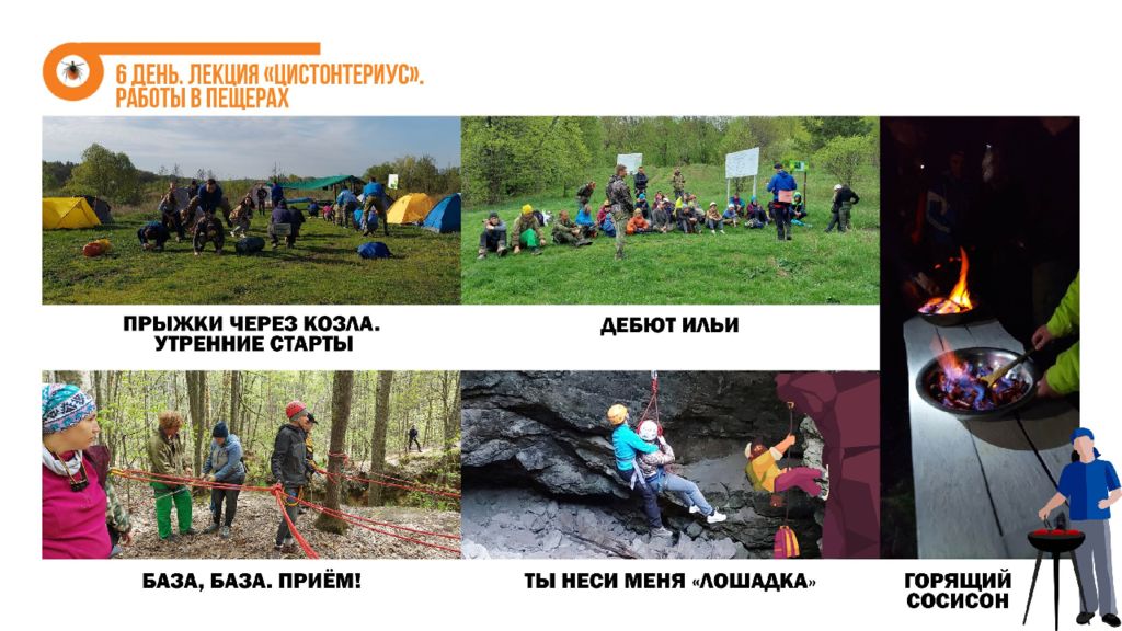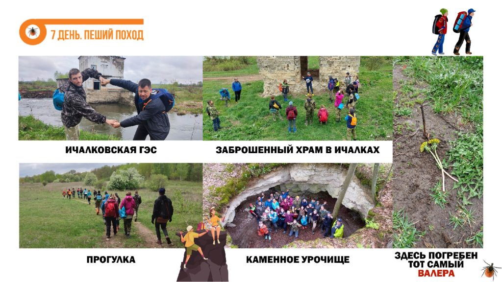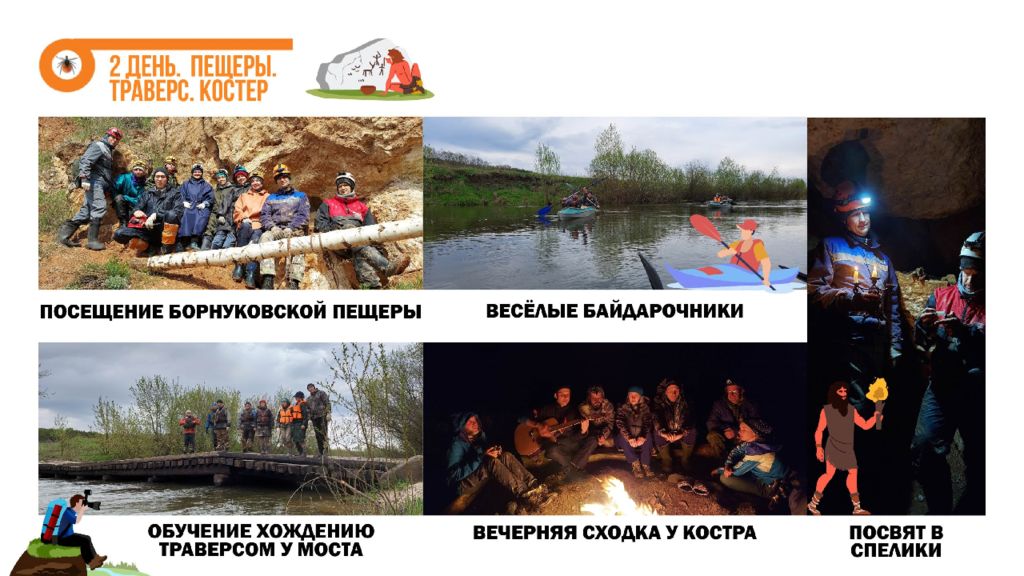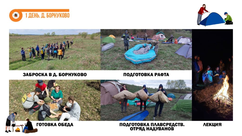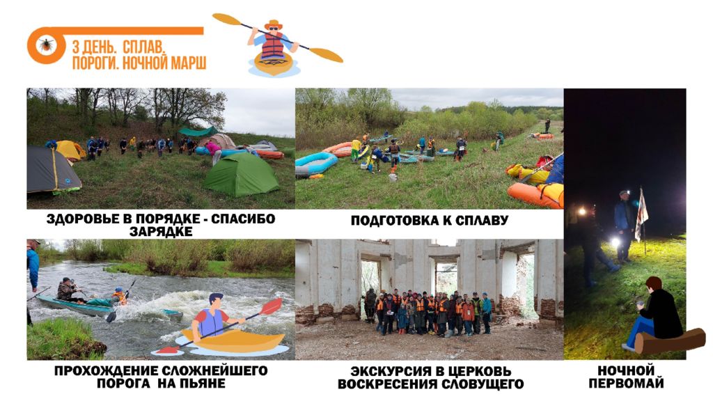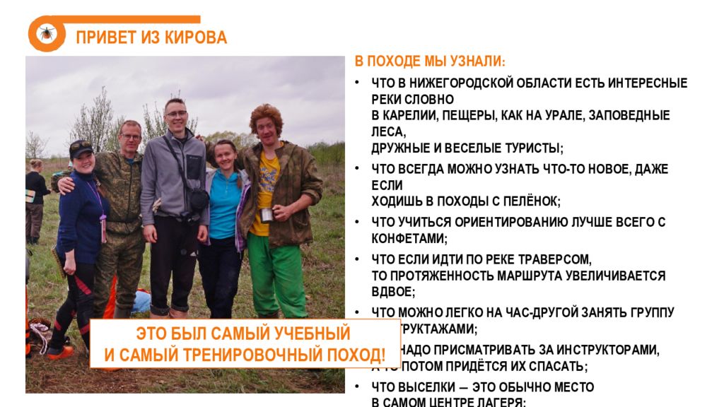 В походе мы узнали : что в Нижегородской области есть интересные реки словно в Карелии, пещеры, как на Урале, заповедные леса, дружные и веселые туристы ; что всегда можно узнать что-то новое, даже если ходишь в походы с пелёнок ; что учиться ориентированию лучше всего с конфетами ; что если идти по реке траверсом, то протяженность маршрута увеличивается вдвое ; что можно легко на час-другой занять группу инструктажами; что надо присматривать за инструкторами, а то потом придётся их спасать ; что выселки ― это обычно место в самом центре лагеря; что в Нижнем байдарки упаковывают не так как в Кирове и не знают, что такое гусятник ; что на Пьяне самые громкоголосые соловьи и лягушки. Привет из кирова Это был самый учебный и самый тренировочный поход !