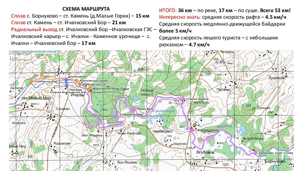 СХЕМА МАРШРУТА Сплав с. Борнуково – ст. Камень ( д.Малые Горки) – 15 км Сплав ст. Камень – ст. Ичалковский Бор – 21 км Радиальный выход ст. Ичалковский бор – Ичалковская ГЭС – Ичалковский карьер – с. Ичалки - Каменное урочище – с. Ичалки – Ичалковский бор – 17 км ИТОГО: 36 км – по реке, 17 км – по суше. Всего 53 км! Интересно знать: средняя скорость рафта – 4.5 км/ч Средняя скорость медленно-движущейся байдарки более 5 км/ч Средняя скорость пешего туриста – с небольшим рюкзаком – 4.7 км/ч
