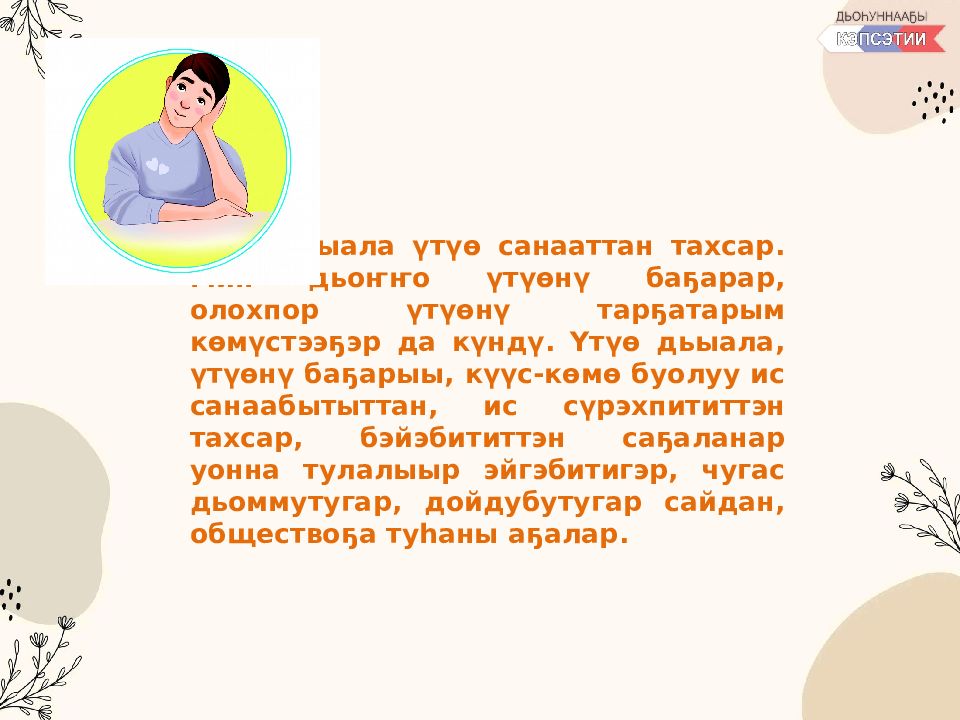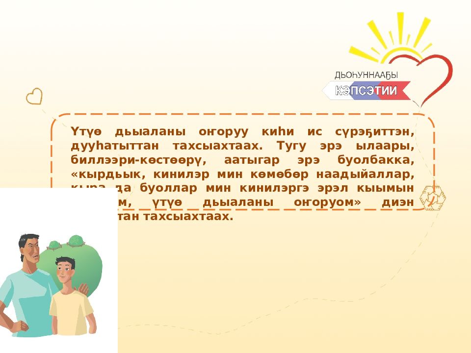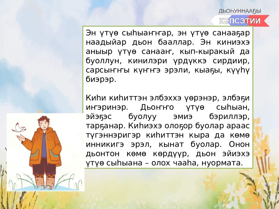 Эн үтүө сыһыаҥҥар, эн үтүө санааҕар наадыйар дьон бааллар. Эн киниэхэ аныыр үтүө санааҥ, кып-кыракый да буоллун, кинилэри үрдүккэ сирдиир, сарсыҥҥы күҥҥэ эрэли, кыаҕы, күүһү биэрэр. Киһи киһиттэн элбэххэ үөрэнэр, элбэҕи иҥэринэр. Дьоҥҥо үтүө сыһыан, эйэҕэс буолуу эмиэ бэриллэр, тарҕанар. Киһиэхэ олоҕор буолар араас түгэннэригэр киһиттэн кыра да көмө инникигэ эрэл, кынат буолар. Онон дьонтон көмө көрдүүр, дьон эйиэхэ үтүө сыһыана – олох чааһа, нуормата.