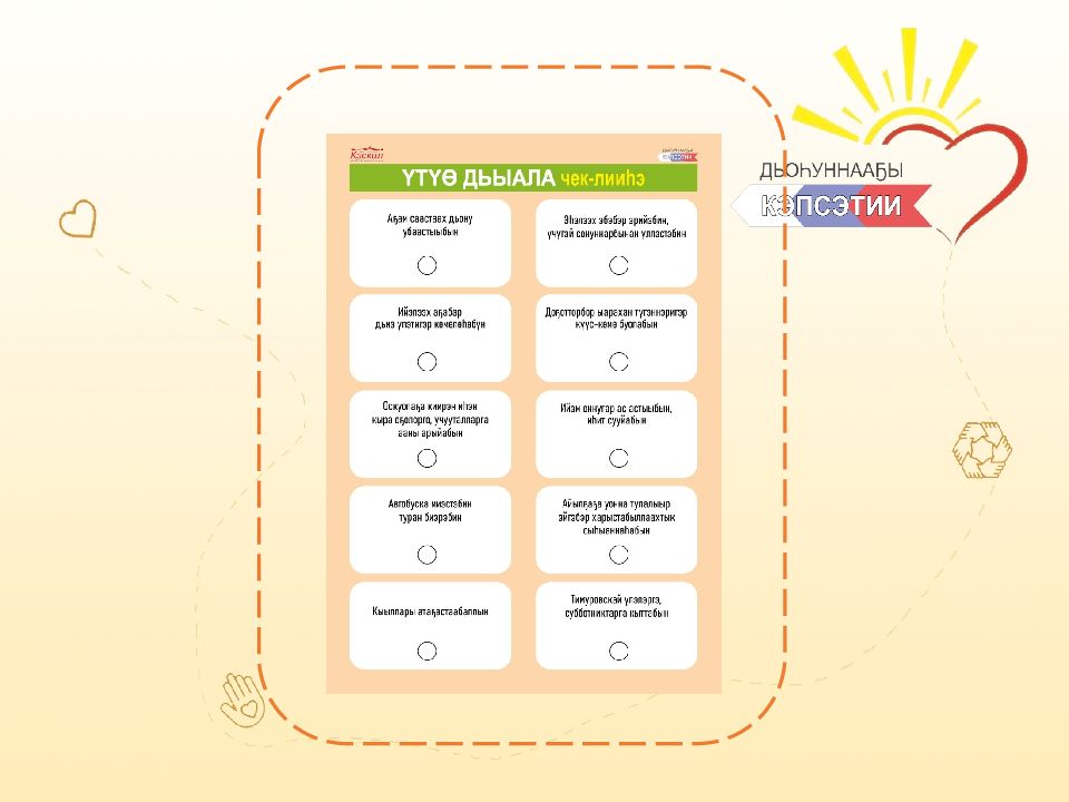 Үтүө дьыаланы оҥоруу киһи ис сүрэҕиттэн, дууһатыттан тахсыахтаах. Тугу эрэ ылаары, биллээри-көстөөрү, аатыгар эрэ буолбакка, «кырдьык, кинилэр мин көмөбөр наадыйаллар, кыра да буоллар мин кинилэргэ эрэл кыымын биэриэм, үтүө дьыаланы оҥоруом» диэн санааттан тахсыахтаах.