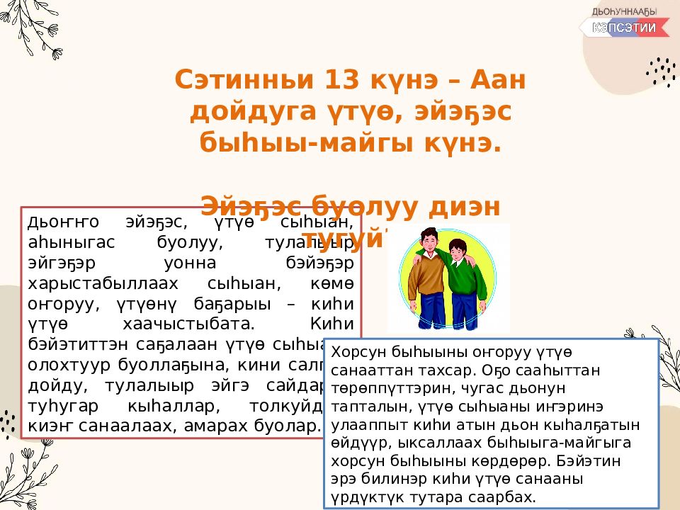 Д ьоҥҥо эйэҕэс, үтүө сыһыан, аһыныгас буолуу, тулалыыр эйгэҕэр уонна бэйэҕэр харыстабыллаах сыһыан, көмө оҥоруу, үтүөнү баҕарыы – киһи үтүө хаачыстыбата. Киһи бэйэтиттэн саҕалаан үтүө сыһыаны олохтуур буоллаҕына, кини салгыы дойду, тулалыыр эйгэ сайдарын туһугар кыһаллар, толкуйдуур киэҥ санаалаах, амарах буолар. Сэтинньи 13 күнэ – Аан дойдуга үтүө, эйэҕэс быһыы-майгы күнэ. Эйэҕэс буолуу диэн тугуй? Хорсун быһыыны оҥоруу үтүө санааттан тахсар. Оҕо сааһыттан төрөппүттэрин, чугас дьонун тапталын, үтүө сыһыаны иҥэринэ улааппыт киһи атын дьон кыһалҕатын өйдүүр, ыксаллаах быһыыга-майгыга хорсун быһыыны көрдөрөр. Бэйэтин эрэ билинэр киһи үтүө санааны үрдүктүк тутара саарбах.