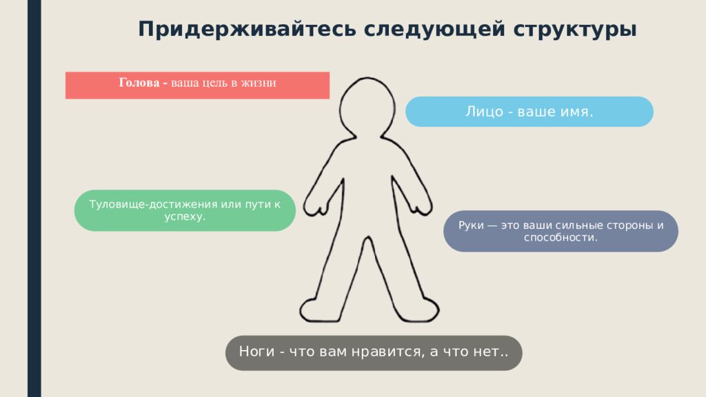 Голова - ваша цель в жизни Лицо - ваше имя. Руки — это ваши сильные стороны и способности. Туловище-достижения или пути к успеху. Ноги - что вам нравится, а что нет..