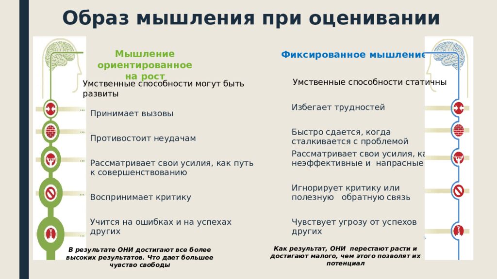 Фиксированное мышление Избегает трудностей Быстро сдается, когда сталкивается с проблемой Рассматривает свои усилия, как неэффективные и напрасные Игнорирует критику или полезную обратную связь Чувствует угрозу от успехов других Принимает вызовы Противостоит неудачам Рассматривает свои усилия, как путь к совершенствованию Воспринимает критику Учится на ошибках и на успехах других Как результат, ОНИ перестают расти и достигают малого, чем этого позволят их потенциал В результате ОНИ достигают все более высоких результатов. Что дает большее чувство свободы Мышление ориентированное на рост Умственные способности могут быть развиты Умственные способности статичны