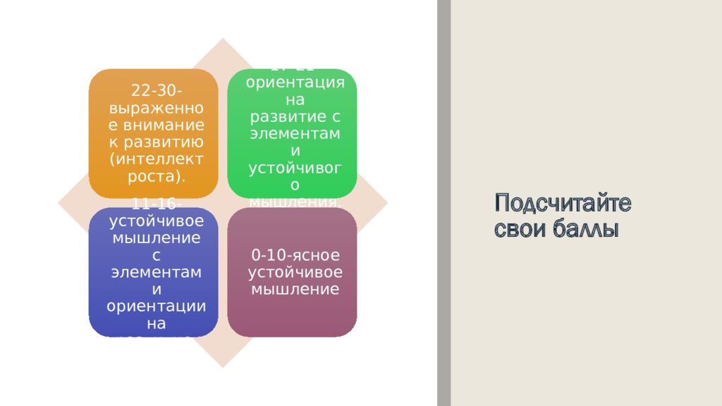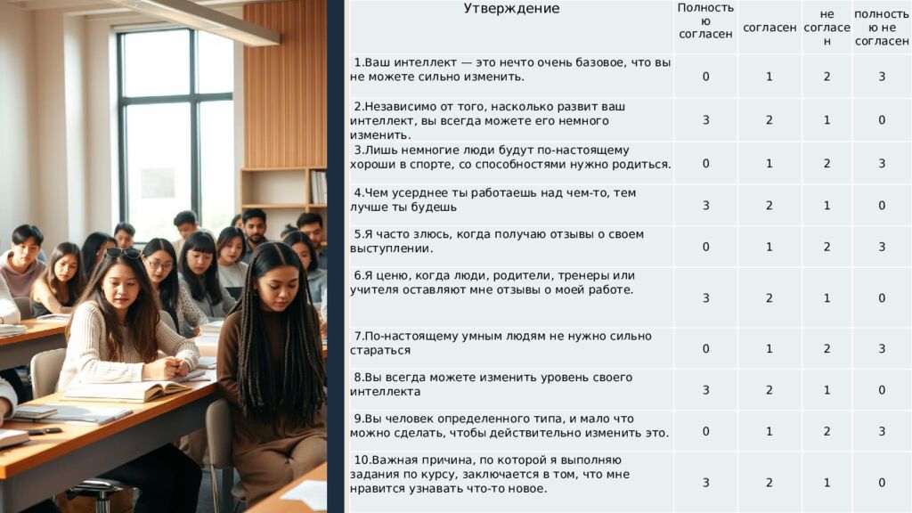 Утверждение Полностью согласен согласен не согласен полностью не согласен 1.Ваш интеллект — это нечто очень базовое, что вы не можете сильно изменить. 0 1 2 3 2.Независимо от того, насколько развит ваш интеллект, вы всегда можете его немного изменить. 3 2 1 0 3.Лишь немногие люди будут по-настоящему хороши в спорте, со способностями нужно родиться. 0 1 2 3 4.Чем усерднее ты работаешь над чем-то, тем лучше ты будешь 3 2 1 0 5.Я часто злюсь, когда получаю отзывы о своем выступлении. 0 1 2 3 6.Я ценю, когда люди, родители, тренеры или учителя оставляют мне отзывы о моей работе. 3 2 1 0 7.По-настоящему умным людям не нужно сильно стараться 0 1 2 3 8.Вы всегда можете изменить уровень своего интеллекта 3 2 1 0 9.Вы человек определенного типа, и мало что можно сделать, чтобы действительно изменить это. 0 1 2 3 10.Важная причина, по которой я выполняю задания по курсу, заключается в том, что мне нравится узнавать что-то новое. 3 2 1 0