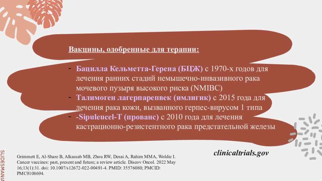 clinicaltrials.gov Grimmett E, Al-Share B, Alkassab MB, Zhou RW, Desai A, Rahim MMA, Woldie I. Cancer vaccines: past, present and future; a review article. Discov Oncol. 2022 May 16;13(1):31. doi : 10.1007/s12672-022-00491-4. PMID: 35576080; PMCID: PMC9108694. Вакцины, одобренные для терапии: Бацилла Кельметта-Герена (БЦЖ) с 1970-х годов для лечения ранних стадий немышечно -инвазивного рака мочевого пузыря высокого риска ( NMIBC) Талимоген лагерпарепвек ( имлигик ) с 2015 года для лечения рака кожи, вызванного герпес-вирусом 1 типа - Sipuleucel -T ( прованс ) с 2010 года для лечения кастрационно -резистентного рака предстательной железы