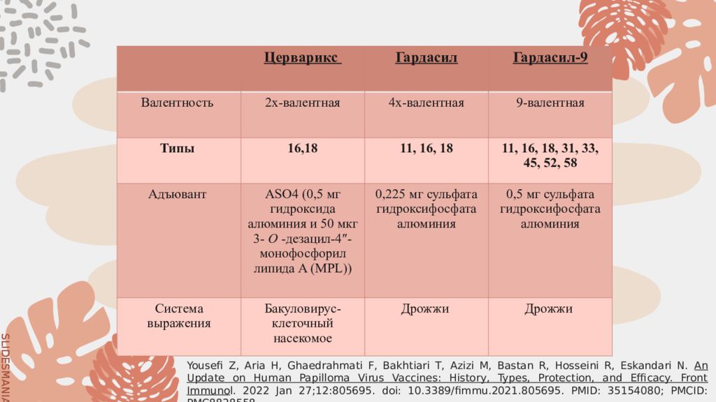 Церварикс Гардасил Гардасил-9 Валентность 2х-валентная 4х-валентная 9-валентная Типы 16,18 11, 16, 18 11, 16, 18, 31, 33, 45, 52, 58 Адъювант ASO4 (0,5 мг гидроксида алюминия и 50 мкг 3- O - дезацил-4″- монофосфорил липида A (MPL)) 0,225 мг сульфата гидроксифосфата алюминия 0,5 мг сульфата гидроксифосфата алюминия Система выражения Бакуловирус -клеточный насекомое Дрожжи Дрожжи Yousefi Z, Aria H, Ghaedrahmati F, Bakhtiari T, Azizi M, Bastan R, Hosseini R, Eskandari N. An Update on Human Papilloma Virus Vaccines: History, Types, Protection, and Efficacy. Front Immuno l. 2022 Jan 27;12:805695. doi : 10.3389/fimmu.2021.805695. PMID: 35154080; PMCID: PMC8828558.