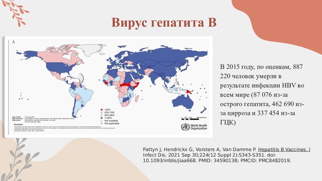 В 2015 году, по оценкам, 887 220 человек умерли в результате инфекции HBV во всем мире (87 076 из-за острого гепатита, 462 690 из-за цирроза и 337 454 из-за ГЦК) Вирус гепатита В Pattyn J, Hendrickx G, Vorsters A, Van Damme P. Hepatitis B Vaccines. J Infect Dis. 2021 Sep 30;224(12 Suppl 2):S343-S351. doi : 10.1093/ infdis /jiaa668. PMID: 34590138; PMCID: PMC8482019.