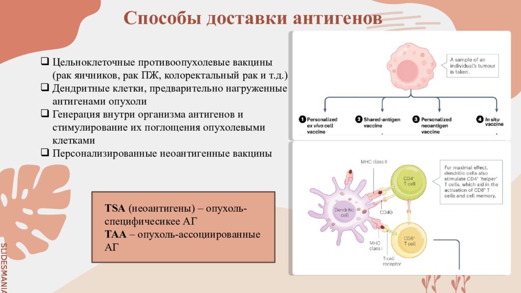 Цельноклеточные противоопухолевые вакцины (рак яичников, рак ПЖ, колоректальный рак и т.д.) Дендритные клетки, предварительно нагруженные антигенами опухоли Генерация внутри организма антигенов и стимулирование их поглощения опухолевыми клетками Персонализированные неоантигенные вакцины Способы доставки антигенов TSA ( неоантигены ) – опухоль- специфичесикее АГ TAA – опухоль-ассоциированные АГ