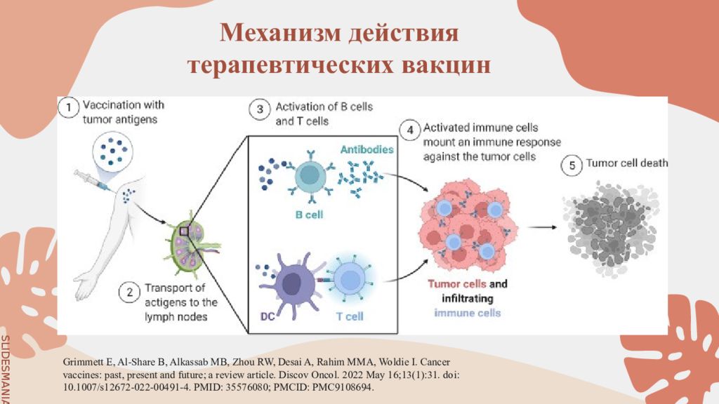 Механизм действия терапевтических вакцин Grimmett E, Al-Share B, Alkassab MB, Zhou RW, Desai A, Rahim MMA, Woldie I. Cancer vaccines: past, present and future; a review article. Discov Oncol. 2022 May 16;13(1):31. doi : 10.1007/s12672-022-00491-4. PMID: 35576080; PMCID: PMC9108694.