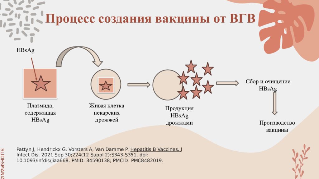 Pattyn J, Hendrickx G, Vorsters A, Van Damme P. Hepatitis B Vaccines. J Infect Dis. 2021 Sep 30;224(12 Suppl 2):S343-S351. doi : 10.1093/ infdis /jiaa668. PMID: 34590138; PMCID: PMC8482019. Плазмида, содержащая HBsAg Живая клетка пекарских дрожжей Сбор и очищение HBsAg Производство вакцины HBsAg Продукция HBsAg дрожжами