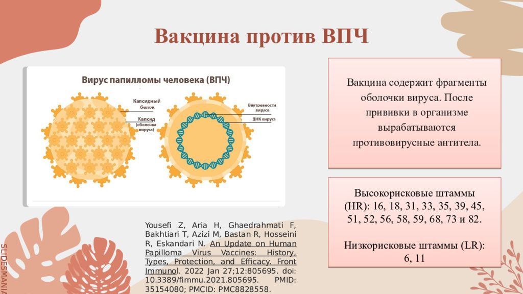 Вакцина содержит фрагменты оболочки вируса. После прививки в организме вырабатываются противовирусные антитела. Высокорисковые штаммы (HR) : 16, 18, 31, 33, 35, 39, 45, 51, 52, 56, 58, 59, 68, 73 и 82. Н изкорисковые штаммы (LR) : 6, 11 Yousefi Z, Aria H, Ghaedrahmati F, Bakhtiari T, Azizi M, Bastan R, Hosseini R, Eskandari N. An Update on Human Papilloma Virus Vaccines: History, Types, Protection, and Efficacy. Front Immuno l. 2022 Jan 27;12:805695. doi : 10.3389/fimmu.2021.805695. PMID: 35154080; PMCID: PMC8828558.