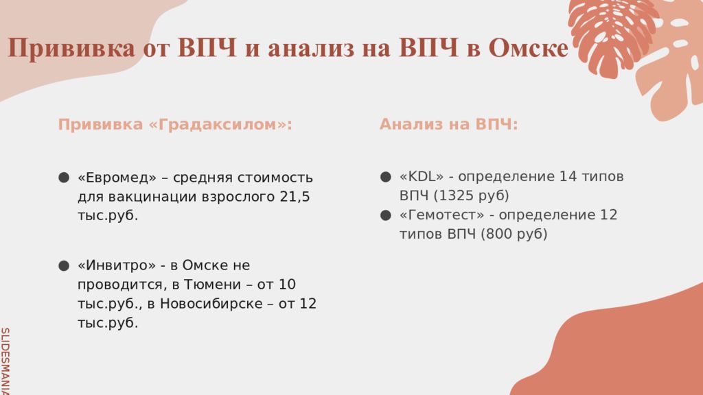 « KDL » - определение 14 типов ВПЧ (1325 руб ) « Гемотест » - определение 12 типов ВПЧ (800 руб ) « Евромед » – средняя стоимость для вакцинации взрослого 21,5 тыс.руб. «Инвитро» - в Омске не проводится, в Тюмени – от 10 тыс.руб., в Новосибирске – от 12 тыс.руб. Прививка « Градаксилом »: Анализ на ВПЧ: Прививка от ВПЧ и анализ на ВПЧ в Омске