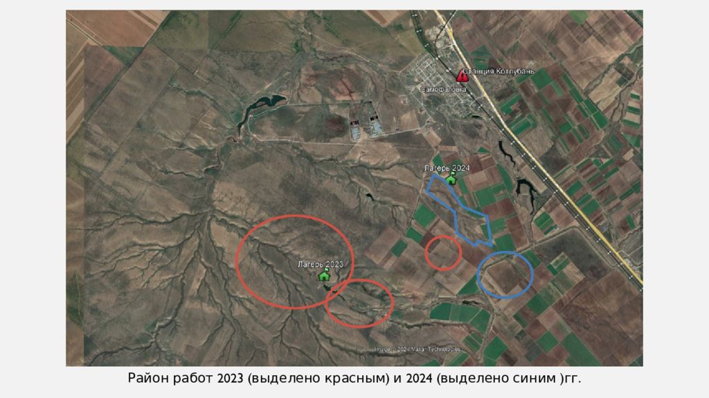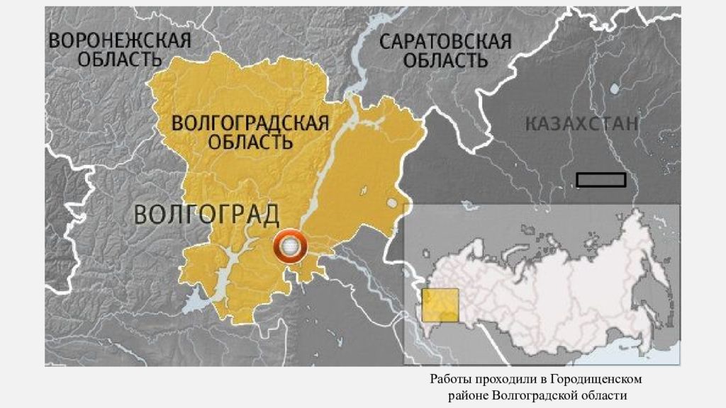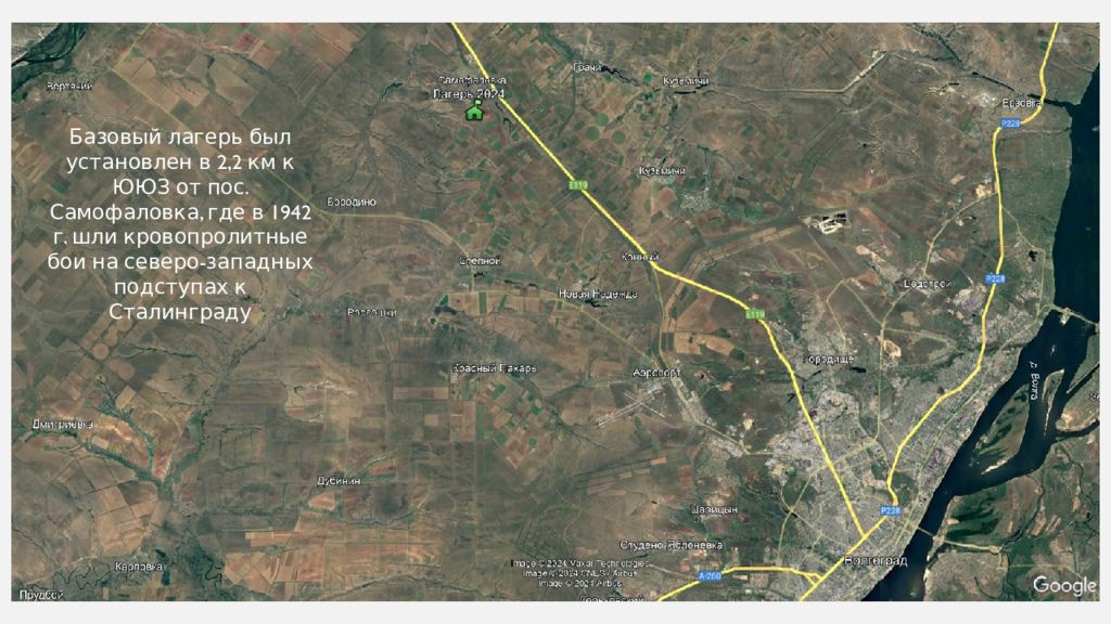 Базовый лагерь был установлен в 2,2 км к ЮЮЗ от пос. Самофаловка, где в 1942 г. шли кровопролитные бои на северо-западных подступах к Сталинграду