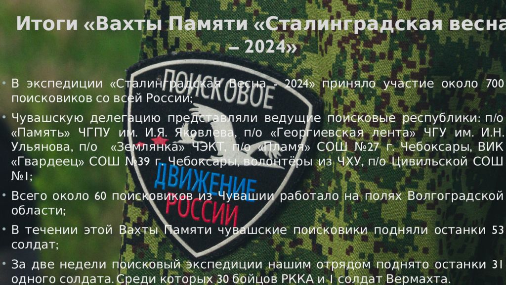 В экспедиции «Сталинградская Весна - 2024» приняло участие около 700 поисковиков со всей России; Чувашскую делегацию представляли ведущие поисковые республики: п/о «Память» ЧГПУ им. И.Я. Яковлева, п/о «Георгиевская лента» ЧГУ им. И.Н. Ульянова, п/о «Землянка» ЧЭКТ, п/о «Пламя» СОШ №27 г. Чебоксары, ВИК «Гвардеец» СОШ №39 г. Чебоксары, волонтёры из ЧХУ, п/о Цивильской СОШ №1; Всего около 60 поисковиков из Чувашии работало на полях Волгоградской области; В течении этой Вахты Памяти чувашские поисковики подняли останки 53 солдат; За две недели поисковый экспедиции нашим отрядом поднято останки 31 одного солдата. Среди которых 30 бойцов РККА и 1 солдат Вермахта. Всего в результате работы поисковиков обнаружено 335 бойцов, более 10 медальонов, установлены имена 3 защитников Отечества. Итоги «Вахты Памяти «Сталинградская весна – 2024»