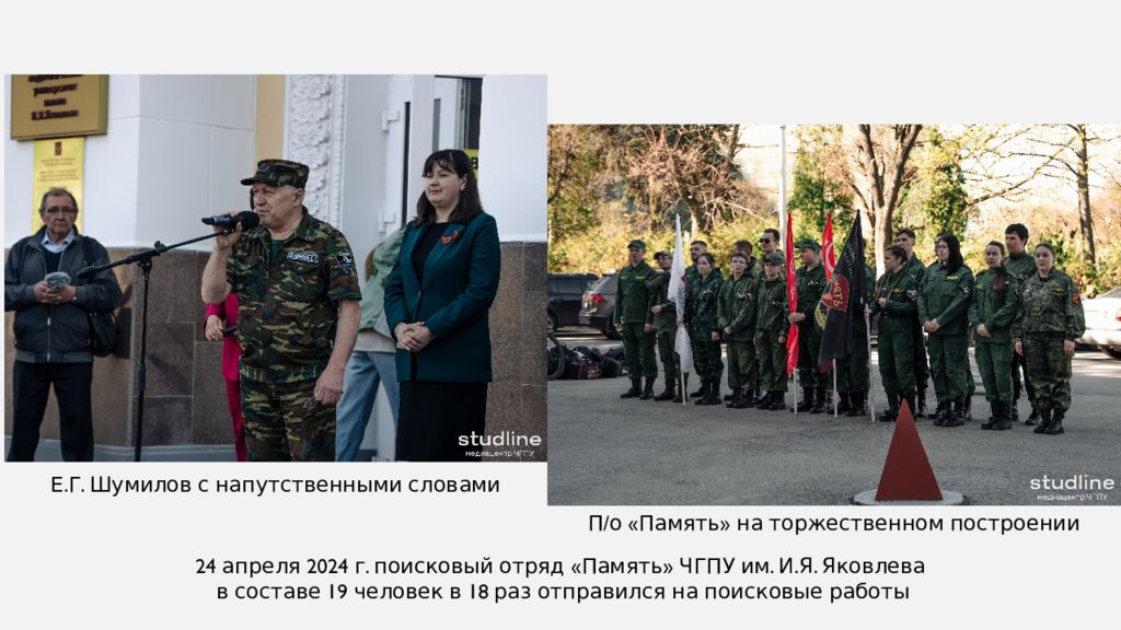 24 апреля 2024 г. поисковый отряд «Память» ЧГПУ им. И.Я. Яковлева в составе 19 человек в 18 раз отправился на поисковые работы Е.Г. Шумилов с напутственными словами П/о «Память» на торжественном построении