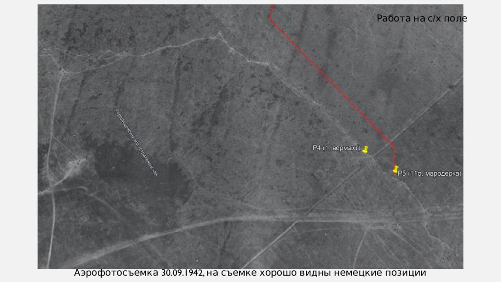 Аэрофотосъемка 30.09.1942, на съемке хорошо видны немецкие позиции Работа на с/х поле