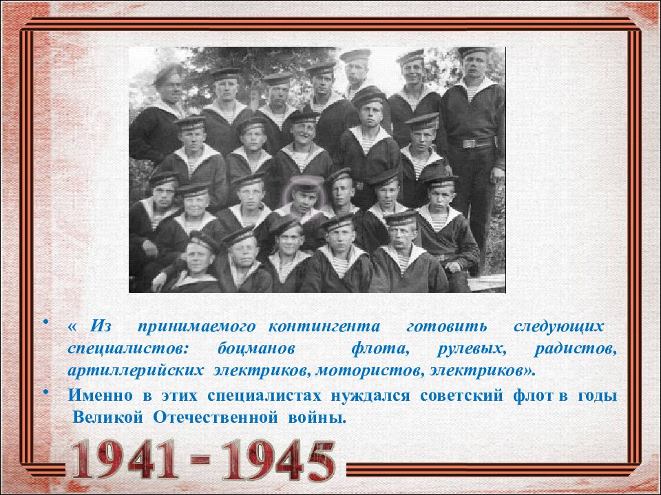 « Из принимаемого контингента готовить следующих специалистов: боцманов флота, рулевых, радистов, артиллерийских электриков, мотористов, электриков». Именно в этих специалистах нуждался советский флот в годы Великой Отечественной войны.