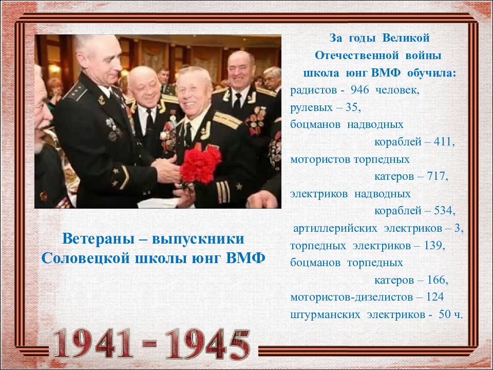 За годы Великой Отечественной войны школа юнг ВМФ обучила: радистов - 946 человек, рулевых – 35, боцманов надводных кораблей – 411, мотористов торпедных катеров – 717, электриков надводных кораблей – 534, артиллерийских электриков – 3, торпедных электриков – 139, боцманов торпедных катеров – 166, мотористов-дизелистов – 124 штурманских электриков - 50 ч.
