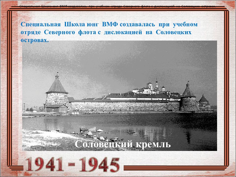 Специальная Школа юнг ВМФ создавалась при учебном отряде Северного флота с дислокацией на Соловецких островах. В приказе о создании Соловецкой школы юнг говорилось: « Школу укомплектовать юношами комсомольцами и не комсомольцами в возрасте 15-16 лет, имеющими образование в объёме 6-7 классов, исключительно добровольцами через комсомольские организации в районах по согласованию с ЦК ВЛКСМ». Специальная Школа юнг ВМФ создавалась при учебном отряде Северного флота с дислокацией на Соловецких островах. Специальная Школа юнг ВМФ создавалась при учебном отряде Северного флота с дислокацией на Соловецких островах.