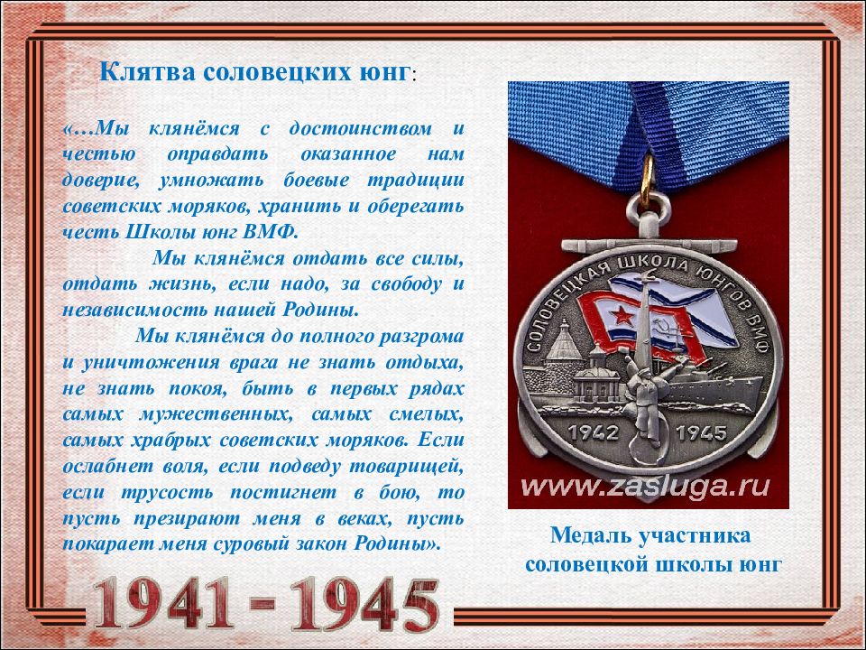 Клятва соловецких юнг : «…Мы клянёмся с достоинством и честью оправдать оказанное нам доверие, умножать боевые традиции советских моряков, хранить и оберегать честь Школы юнг ВМФ. Мы клянёмся отдать все силы, отдать жизнь, если надо, за свободу и независимость нашей Родины. Мы клянёмся до полного разгрома и уничтожения врага не знать отдыха, не знать покоя, быть в первых рядах самых мужественных, самых смелых, самых храбрых советских моряков. Если ослабнет воля, если подведу товарищей, если трусость постигнет в бою, то пусть презирают меня в веках, пусть покарает меня суровый закон Родины».