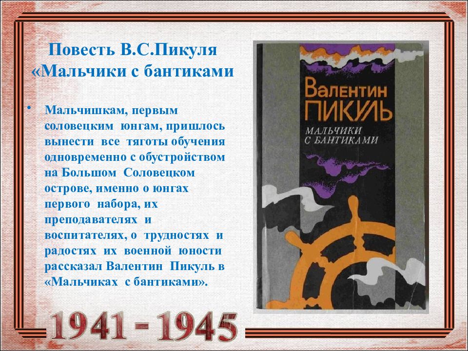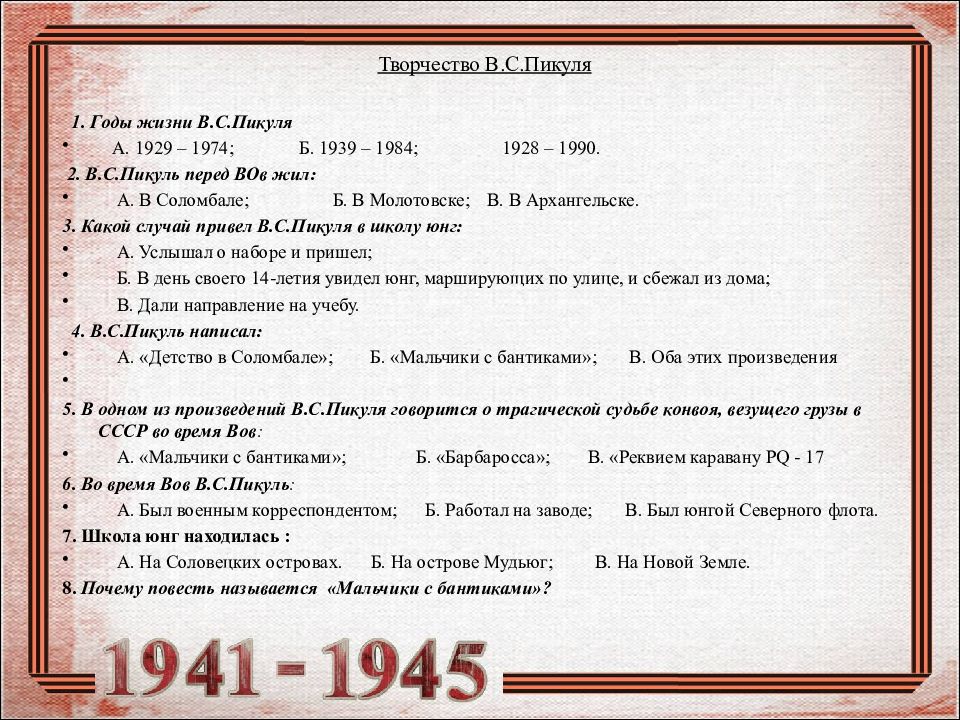 Творчество В.С.Пикуля 1. Годы жизни В.С.Пикуля А. 1929 – 1974 ; Б. 1939 – 1984 ; 1928 – 1990. 2. В.С.Пикуль перед ВОв жил: А. В Соломбале ; Б. В Молотовске ; В. В Архангельске. 3. Какой случай привел В.С.Пикуля в школу юнг: А. Услышал о наборе и пришел; Б. В день своего 14-летия увидел юнг, марширующих по улице, и сбежал из дома; В. Дали направление на учебу. 4. В.С.Пикуль написал: А. «Детство в Соломбале »; Б. «Мальчики с бантиками »; В. Оба этих произведения 5. В одном из произведений В.С.Пикуля говорится о трагической судьбе конвоя, везущего грузы в СССР во время Вов : А. «Мальчики с бантиками»; Б. «Барбаросса »; В. «Реквием каравану PQ - 17 6. Во время Вов В.С.Пикуль : А. Был военным корреспондентом; Б. Работал на заводе; В. Был юнгой Северного флота. 7. Школа юнг находилась : А. На Соловецких островах. Б. На острове Мудьюг ; В. На Новой Земле. 8. Почему повесть называется «Мальчики с бантиками»?