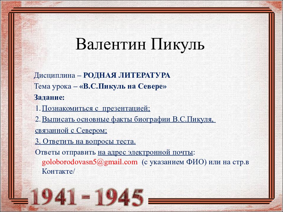 Дисциплина – РОДНАЯ ЛИТЕРАТУРА Тема урока – «В.С.Пикуль на Севере» Задание: Познакомиться с презентацией; Выписать основные факты биографии В.С.Пикуля, связанной с Севером; 3. Ответить на вопросы теста. Ответы отправить на адрес электронной почты : goloborodovasn5@gmail.com (с указанием ФИО) или на стр.в Контакте /