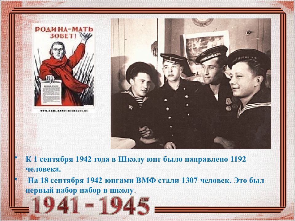 К 1 сентября 1942 года в Школу юнг было направлено 1192 человека. На 18 сентября 1942 юнгами ВМФ стали 1307 человек. Это был первый набор набор в школу.