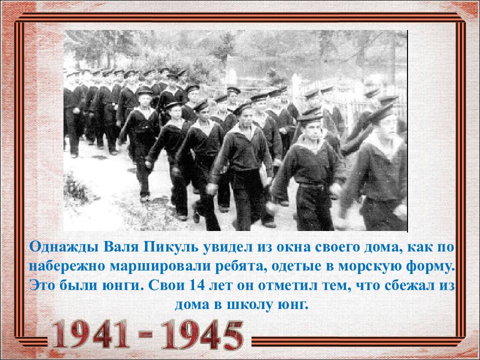 Слайд 14: Однажды Валя Пикуль увидел из окна своего дома, как по набережно маршировали ребята, одетые в морскую форму. Это были юнги. Свои 14 лет он отметил тем, что сбежал из дома в школу юнг