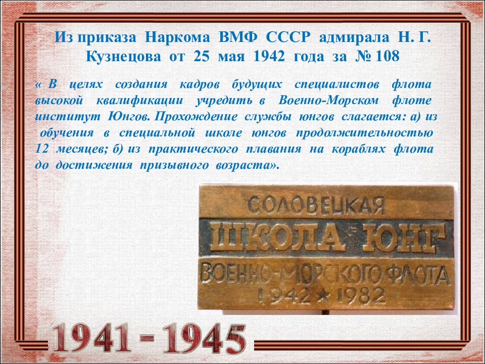 « В целях создания кадров будущих специалистов флота высокой квалификации учредить в Военно-Морском флоте институт Юнгов. Прохождение службы юнгов слагается: а) из обучения в специальной школе юнгов продолжительностью 12 месяцев; б) из практического плавания на кораблях флота до достижения призывного возраста».