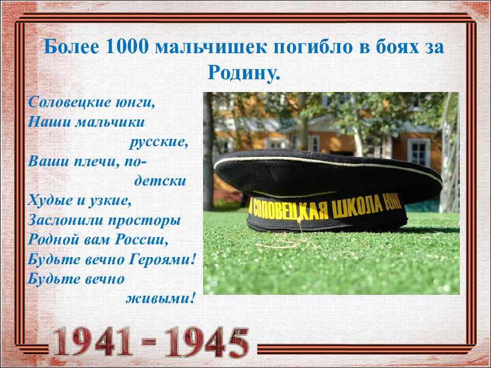 Слайд 18: Более 1000 мальчишек погибло в боях за Родину