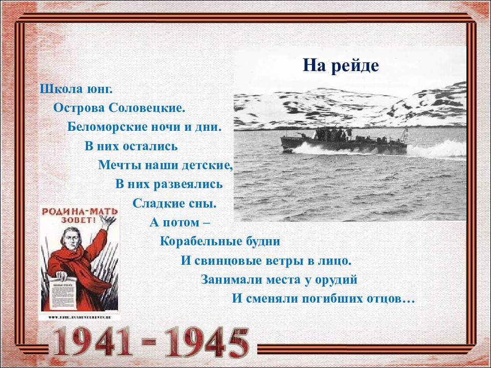 Школа юнг. Острова Соловецкие. Беломорские ночи и дни. В них остались Мечты наши детские, В них развеялись Сладкие сны. А потом – Корабельные будни И свинцовые ветры в лицо. Занимали места у орудий И сменяли погибших отцов…