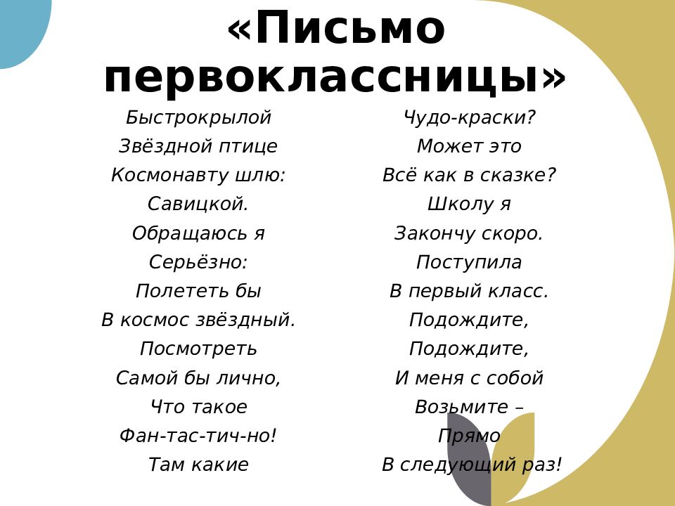 Быстрокрылой Звёздной птице Космонавту шлю: Савицкой. Обращаюсь я Серьёзно : Полететь бы В космос звёздный. Посмотреть Самой бы лично, Что такое Фан-тас-тич-но ! Там какие Чудо-краски ? Может это Всё как в сказке? Школу я Закончу скоро. Поступила В первый класс. Подождите, Подождите, И меня с собой Возьмите – Прямо В следующий раз!