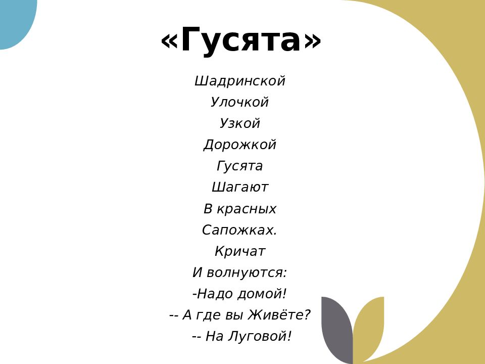 Шадринской Улочкой Узкой Дорожкой Гусята Шагают В красных Сапожках. Кричат И волнуются: Надо домой! - А где вы Живёте? - На Луговой!
