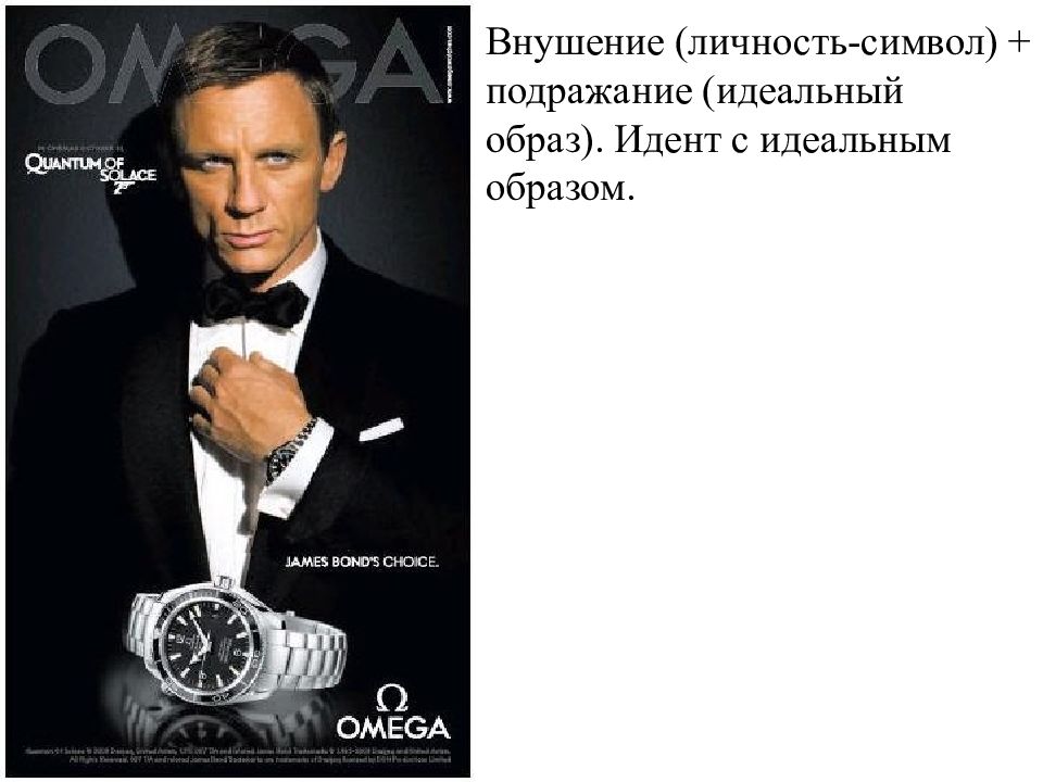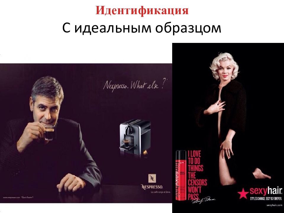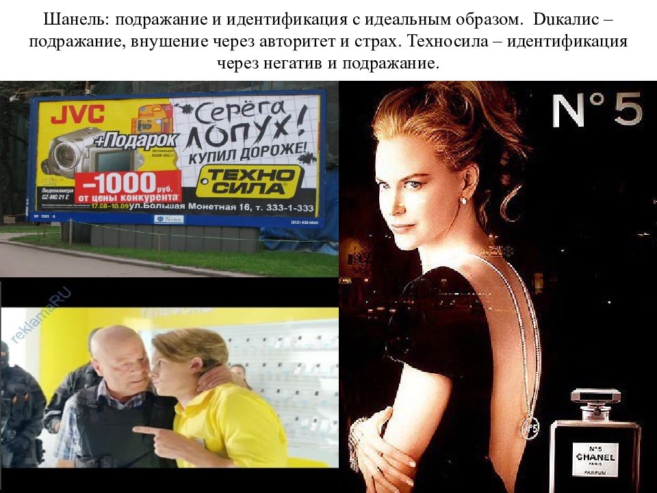Шанель: подражание и идентификация с идеальным образом. Du калис – подражание, внушение через авторитет и страх. Техносила – идентификация через негатив и подражание.