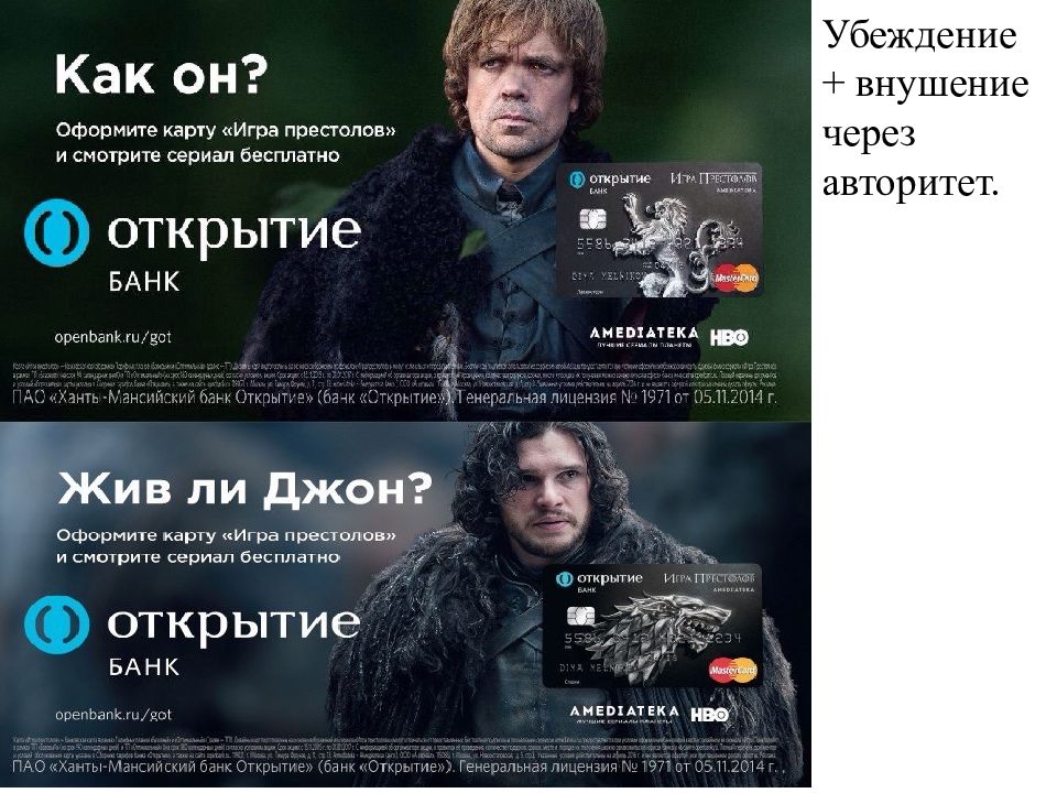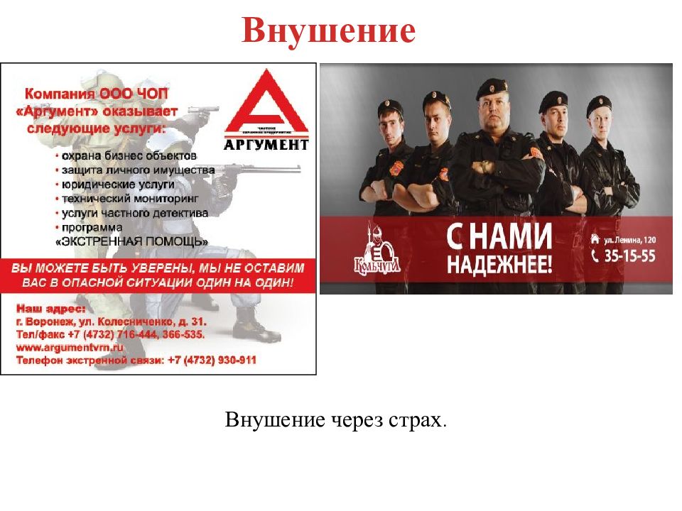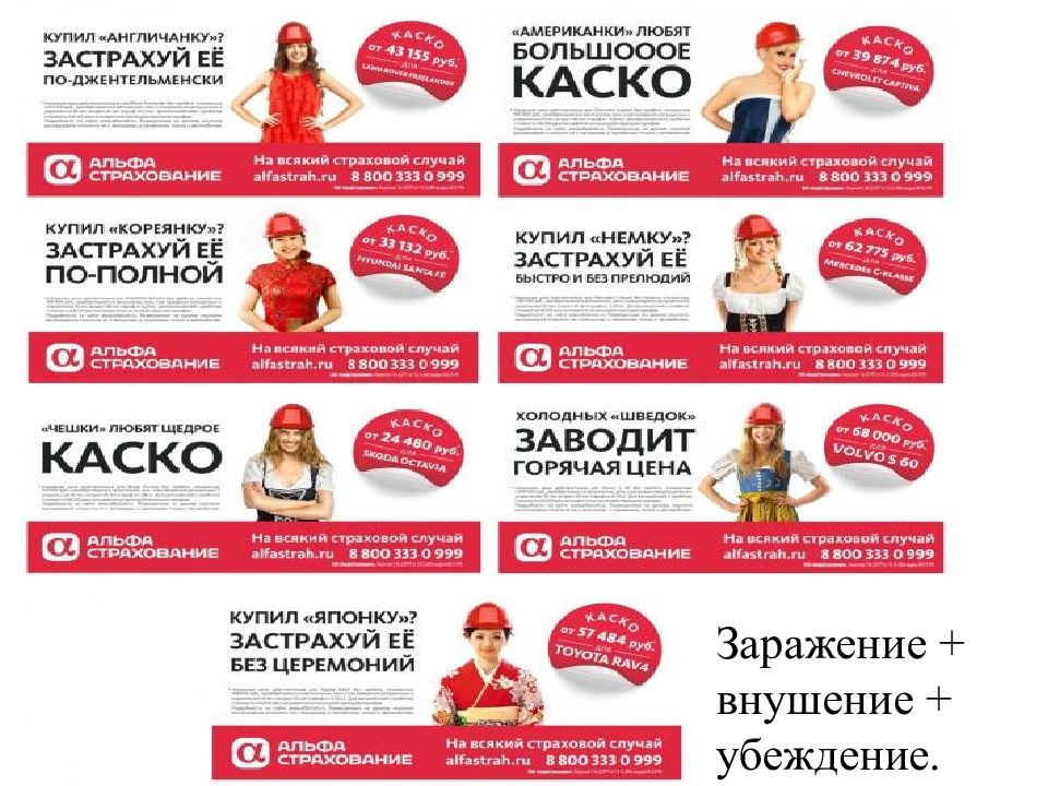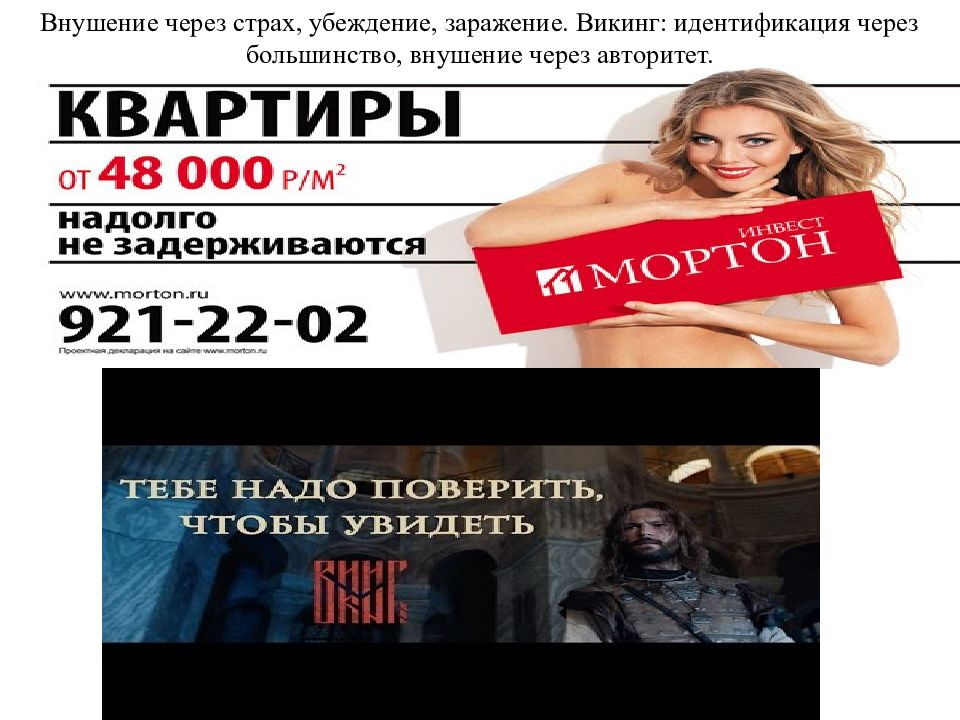 Внушение через страх, убеждение, заражение. Викинг: идентификация через большинство, внушение через авторитет.