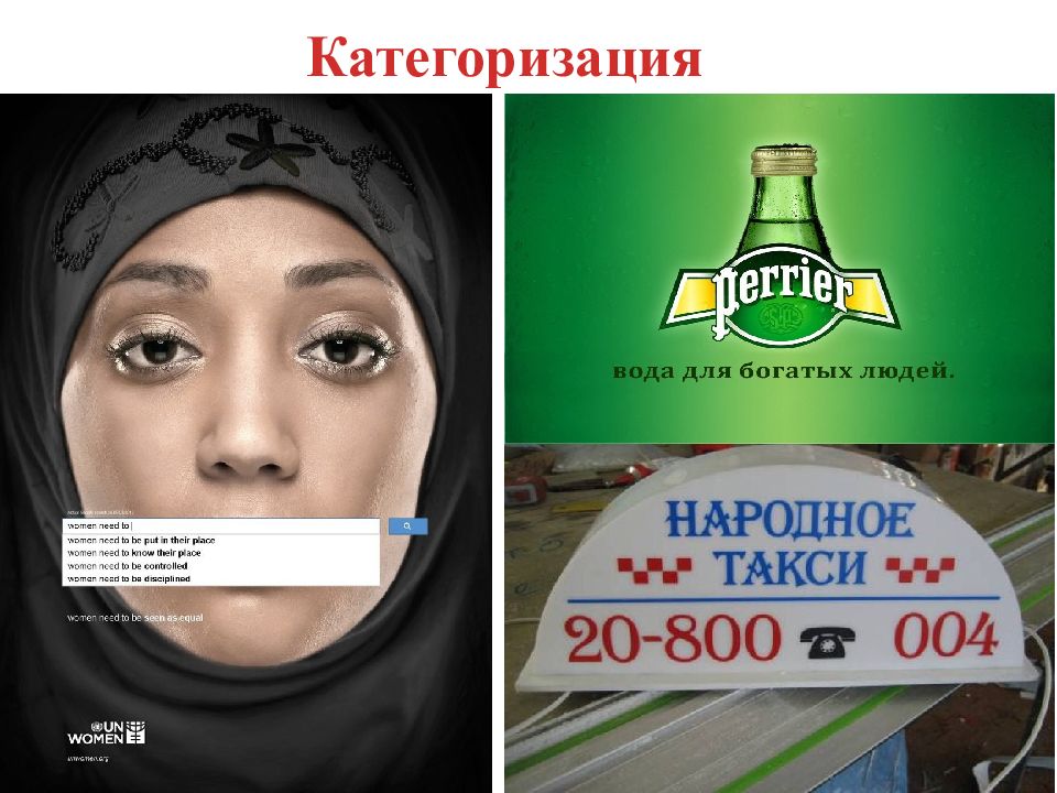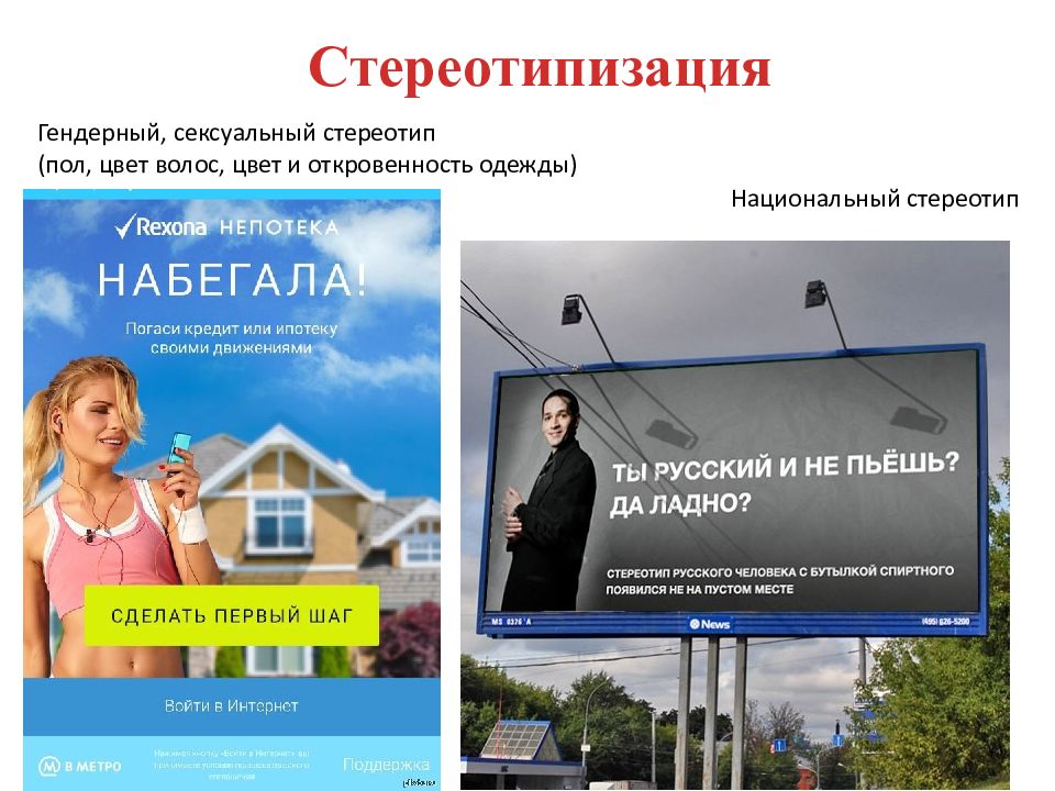 Стереотипизация Гендерный, сексуальный стереотип (пол, цвет волос, цвет и откровенность одежды) Национальный стереотип