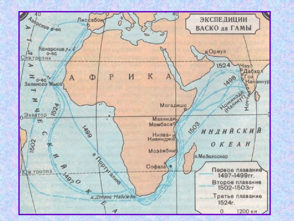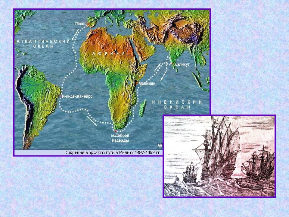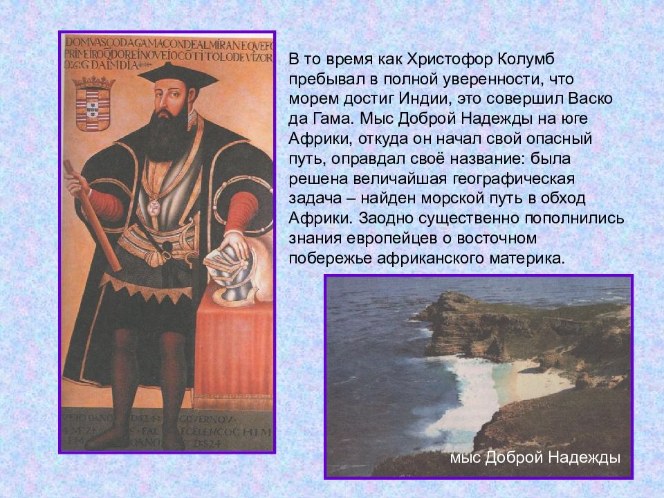 В то время как Христофор Колумб пребывал в полной уверенности, что морем достиг Индии, это совершил Васко да Гама. Мыс Доброй Надежды на юге Африки, откуда он начал свой опасный путь, оправдал своё название: была решена величайшая географическая задача – найден морской путь в обход Африки. Заодно существенно пополнились знания европейцев о восточном побережье африканского материка. мыс Доброй Надежды